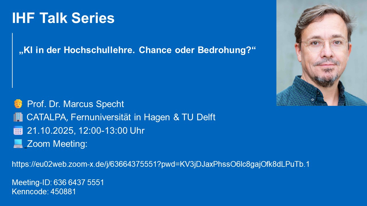 Am 21. Oktober 2025 wird Prof. Dr. Marcus Specht, CATALPA, Fernuniversität Hagen & TU Delft, zum Thema "KI in der Hochschullehre. Chance oder Bedrohung?" in unserer Veranstaltungsreihe IHF Talk Series vortragen. Die Veranstaltung dauert von 12:00 bis 13:00 Uhr.